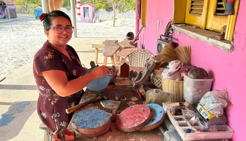 No litoral do Piauí, Nêda Lopes constrói pequenas “vilinhas” com madeira reaproveitada trazida pela maré, além de bolsas de fibras naturais e luminárias artesanais. Para ela, são as mulheres que mantêm viva a tradição dentro das famílias. “Eu aprendi vendo minha avó e minhas tias fazerem artesanato. É dentro de casa que essa cultura é transmitida”, conta.