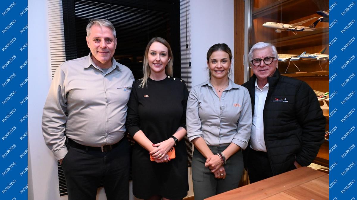 Eduardo Moraes, da Air France-KLM, Bruna Dubeski e Carina Tosello, da Gol, e Juarez Cintra, da Ancoradouro
