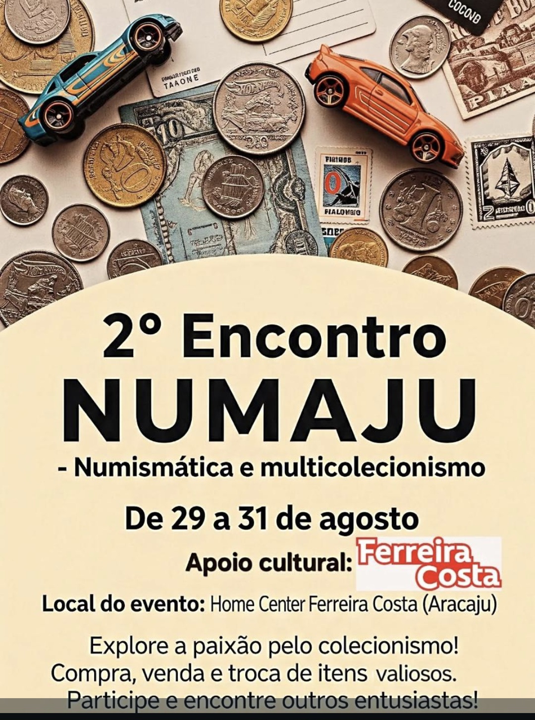 Aracaju se prepara para receber um dos maiores eventos de colecionismo do Nordeste. Nos dias 29, 30 e 31 de agosto, o mall do home center Ferreira Costa será palco do 2º Encontro NUMAJU – Numismática e Multicolecionismo. O evento, com entrada gratuita, acontecerá das 10h às 18h e promete ser um paraíso para os entusiastas de itens raros e históricos.