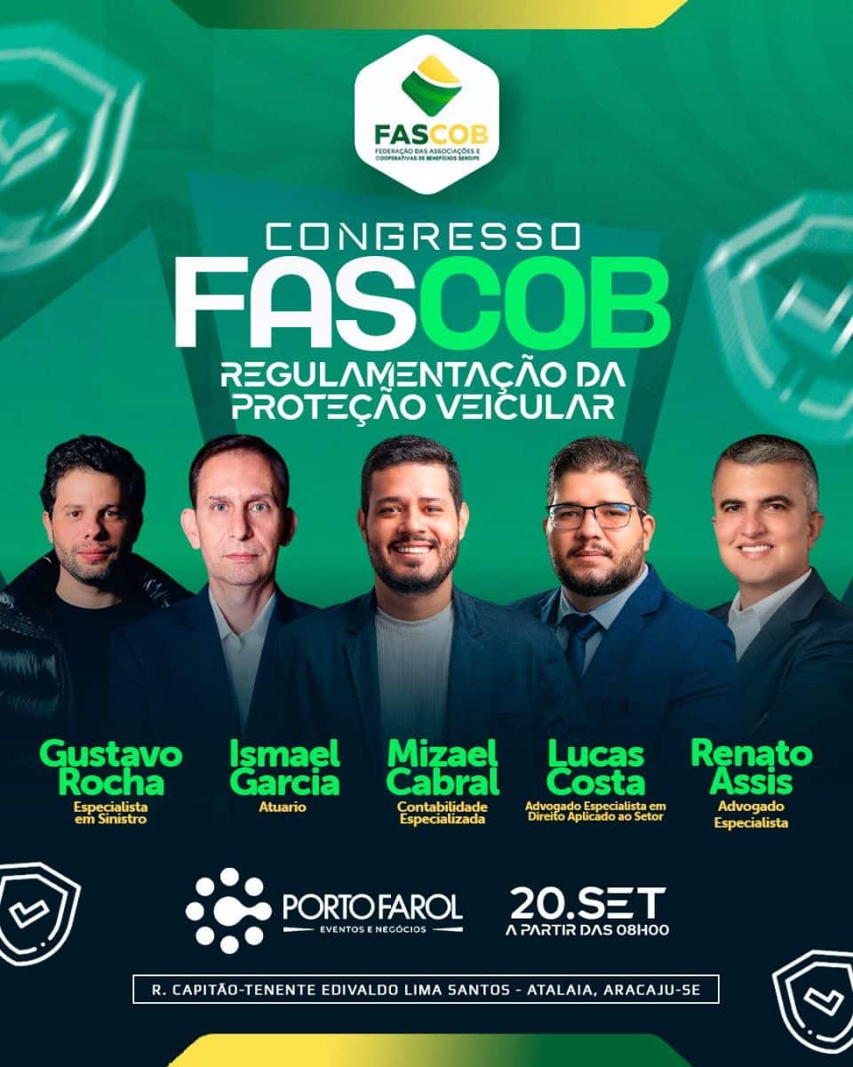 Aracaju sedia Congresso FASCOB sobre regulamentação da proteção veicularo próximo dia 20 de setembro (sábado), Aracaju será palco de um dos eventos mais importantes do setor de proteção veicular no Nordeste: o Congresso FASCOB. Promovido pela Federação das Associações e Cooperativas de Benefícios (FASCOB), o encontro será realizado no Porto Farol Eventos, a partir das 8h, reunindo especialistas de destaque nacional.