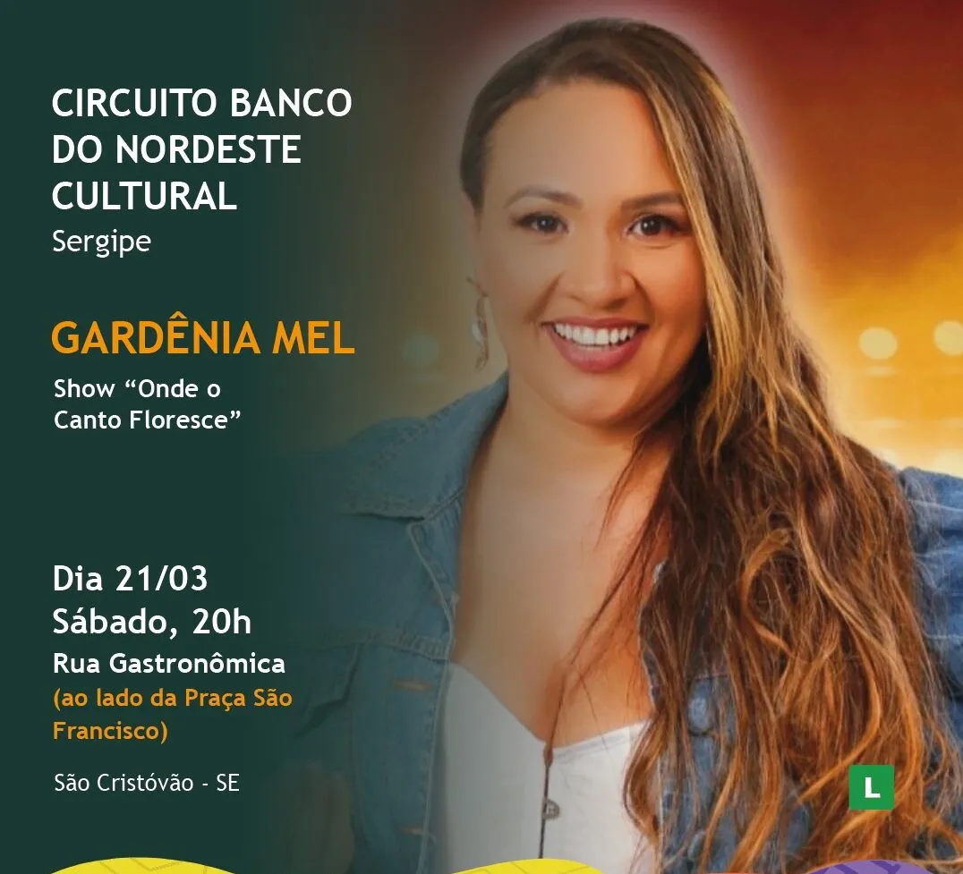 E no sábado (21), a cantora Gardênia Mel apresenta o projeto “Onde o Canto Floresce”, que leva muita autenticidade regional à Rua Gastronômica, em São Cristóvão. O show da cantora estanciana conta com um repertório experiente, das bandas de forró por onde passou. A apresentação começa às 20h. O circuito leva ações culturais aos municípios da Grande Aracaju, no âmbito do Programa de Desenvolvimento Territorial do Banco do Nordeste (Prodeter).
