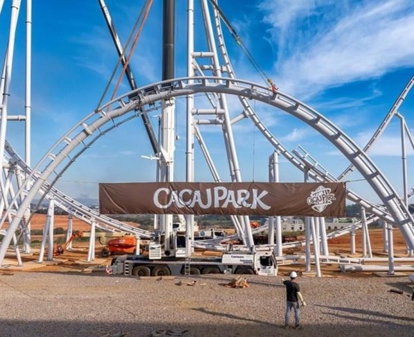 Na semana passada, o Cacau Park atingiu um marco considerado importante: a montagem do “Top Hat” (elemento que consiste em uma subida quase vertical seguida por uma descida na mesma inclinação, com o trem geralmente saindo na direção oposta à entrada) da montanha-russa Ghostrider.