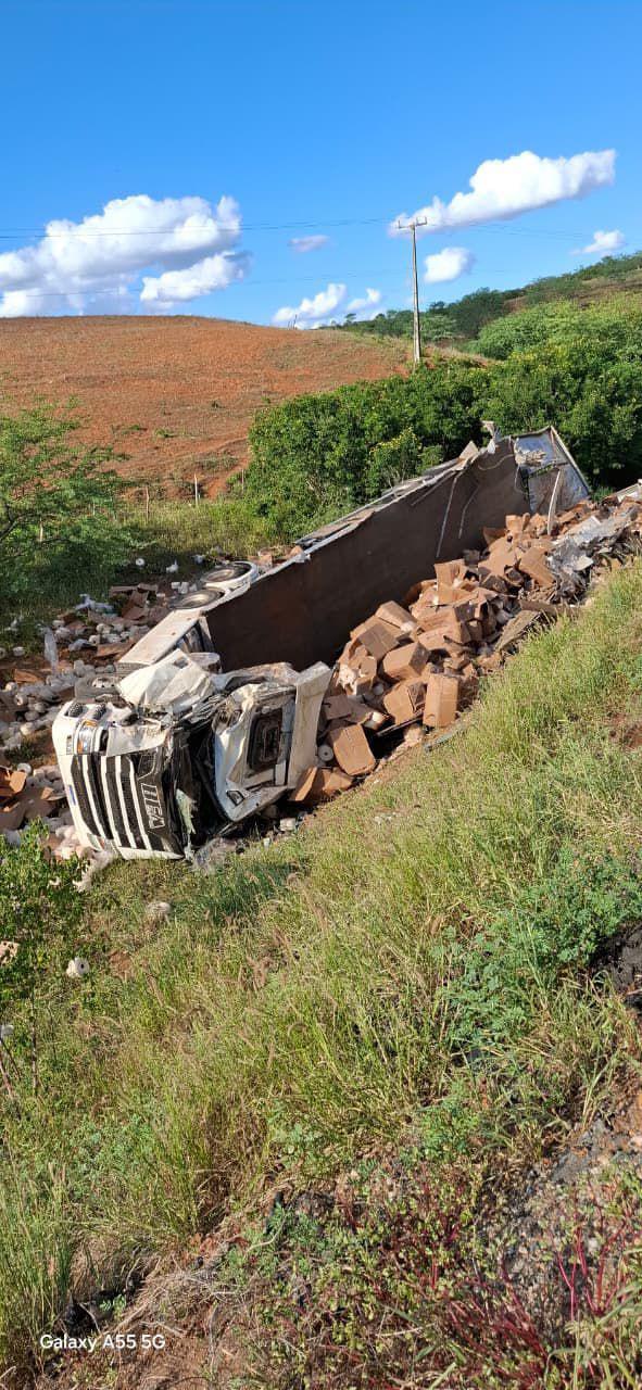 Uma carreta tombou ao fazer uma curva em um trecho conhecido como “Curva do Baiano”. De acordo com as informações, o condutor teria perdido o controle da direção, provocando o acidente.