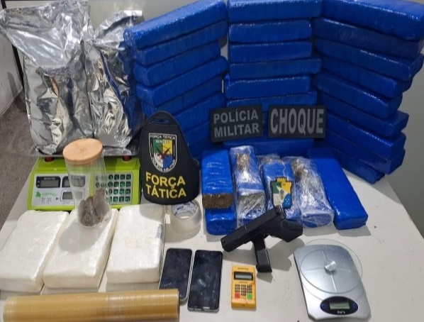 Durante as buscas no imóvel, foram encontradas grandes quantidades de maconha e cocaína. No total foram apreendidos 34 tabletes de maconha, três de cocaína, três balanças de precisão, um simulacro de arma de fogo, além da quantidade de maconha encontrada no interior do veículo.