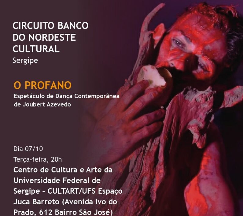 Já na terça (7), às 20h, o bailarino Joubert Azevedo apresenta o espetáculo Profano, que mistura linguagem corporal a temas como gênero, religião e liberdade, no Centro de Cultura e Arte (Cultart) da Universidade Federal de Sergipe, no Bairro São José, na capital. O Circuito BNB Cultural leva ações culturais aos municípios da Grande Aracaju, no âmbito do Programa de Desenvolvimento Territorial do Banco do Nordeste (Prodeter).