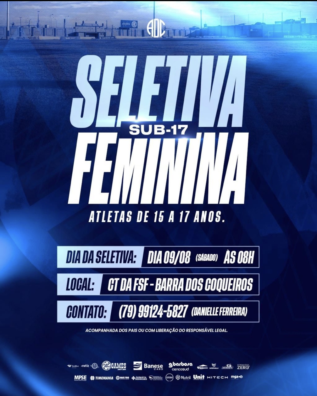 A seletiva acontecerá no CT da Federação Sergipana de Futebol, na Barra dos Coqueiros, a partir das 8h. Podem participar meninas com idades entre 15 e 17 anos, que deverão estar acompanhadas dos pais ou apresentar autorização assinada por um responsável legal.