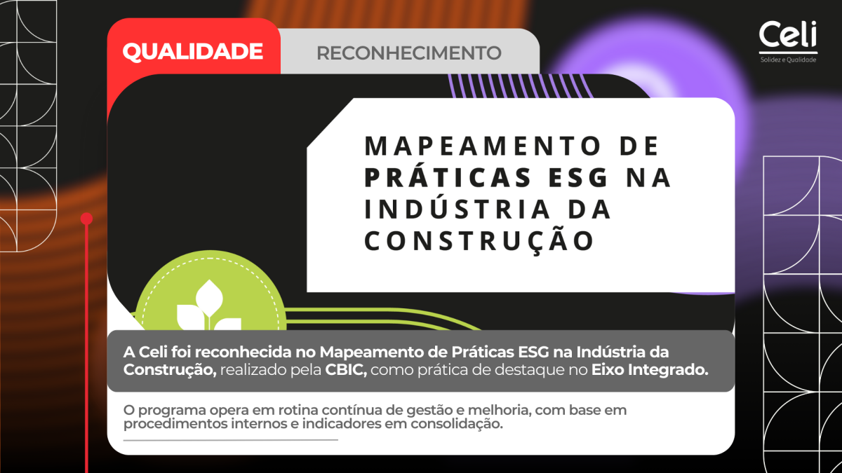 A Construtora Celi foi reconhecida pela Câmara Brasileira da Indústria da Construção (CBIC) como empresa de destaque no Eixo Integrado do Mapeamento de Práticas ESG na Indústria da Construção 2025. O reconhecimento evidencia a incorporação estruturada e simultânea das dimensões Ambiental, Social e de Governança (ESG) à gestão empresarial e às rotinas de obra da companhia, que se destacou como referência na Região Nordeste.