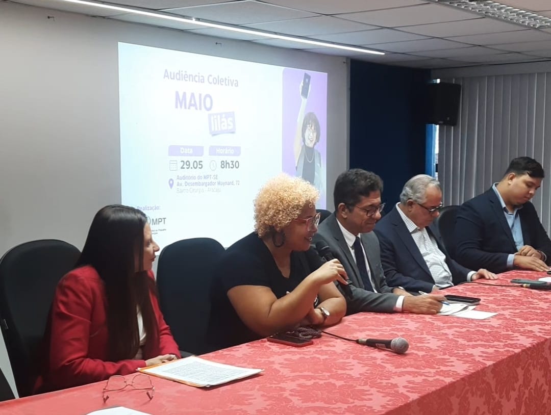 A Audiência Coletiva Maio Lilás, realizada pelo Ministério Público do Trabalho (MPT/SE) em seu auditório, na quinta-feira, 29 de maio, reuniu na mesa de abertura a vice-presidenta da Central Única dos Trabalhadores (CUT-SE), Caroline Santos, a CDL, a Força Sindical, o Centro Acadêmico de Direito da UFS e procurador do Trabalho, Ricardo Carneiro.