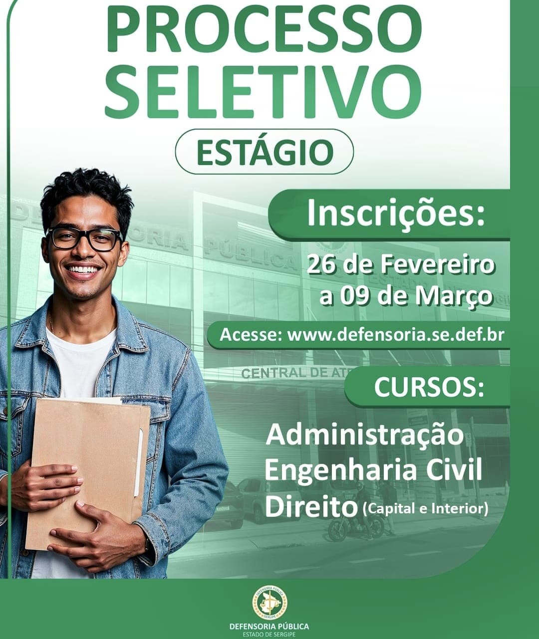 A Defensoria Pública do Estado, por meio da Comissão de Processo Seletivo de Estágio, abre nesta quinta-feira (26), a partir das 8h, as inscrições para o processo seletivo para estágio remunerado nos cursos de direito, administração e engenharia civil.