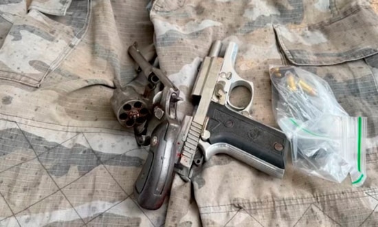 No local, foram apreendidas duas armas de fogo, uma pistola calibre .380 e um revólver calibre .32, além de um colete com identificação da Polícia Civil, uma balaclava e roupas semelhantes às usadas por forças de segurança.