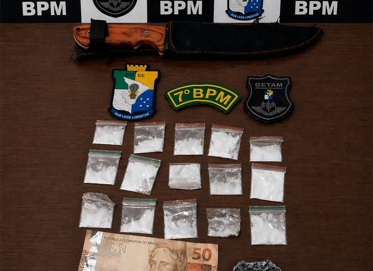 Durante as diligências, dois indivíduos foram identificados. Os policiais observaram que um deles apresentava um volume na cintura. Ao ser questionado, ele informou que se tratava de uma faca. Na abordagem e revista pessoal, foram encontradas embalagens contendo substância análoga à cocaína escondidas junto ao objeto.