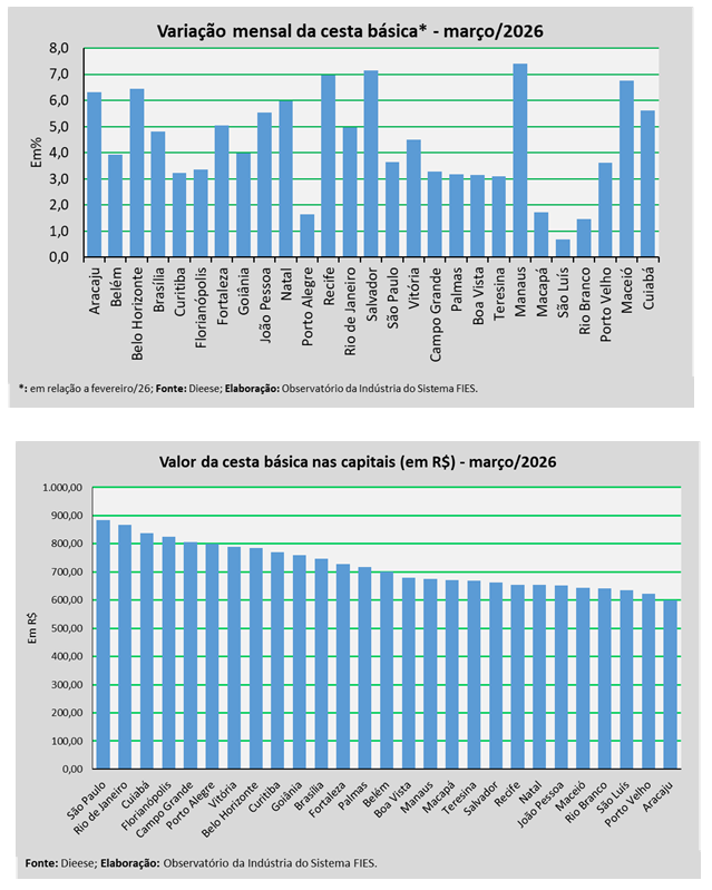 No mês analisado, levando-se em consideração a comparação com o mês anterior (fevereiro/2026), observou-se aumento no valor da cesta básica nas 27 capitais brasileiras, com destaque para: Manaus (+7,42%), Salvador (+7,15%) e Recife (+6,97%).