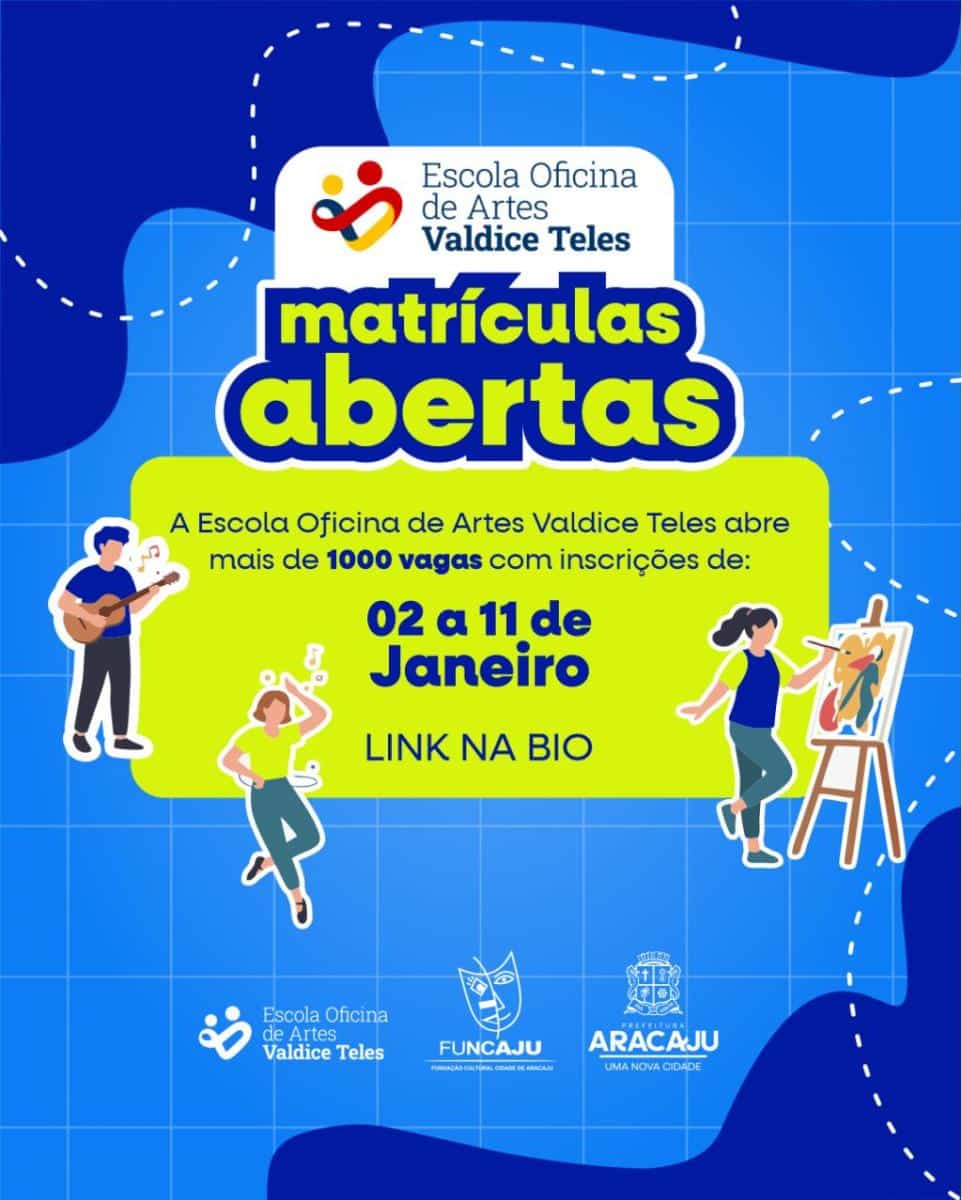 A Prefeitura de Aracaju, por meio da Fundação Cultural Cidade de Aracaju (Funcaju), através da Escola Oficina de Artes Valdice Teles, abriu as inscrições para ingresso nas oficinas do primeiro semestre de 2026. O período de inscrição segue até o dia 11 de janeiro e deve ser realizado por meio de formulário online, disponível no edital e nas redes sociais da Funcaju.