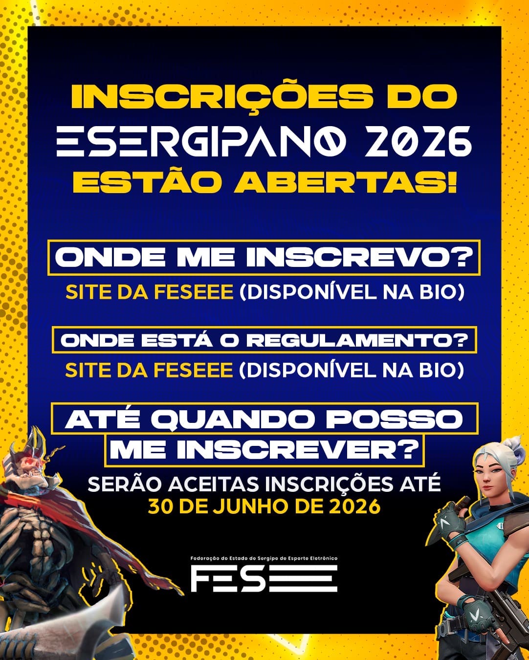 A competição reunirá alguns dos melhores gamers de Sergipe, com disputas iniciando de forma online a partir do mês de junho. As inscrições podem ser realizadas diretamente no site oficial da federação, por meio do link: https://feseee.com.br/inscricoes/