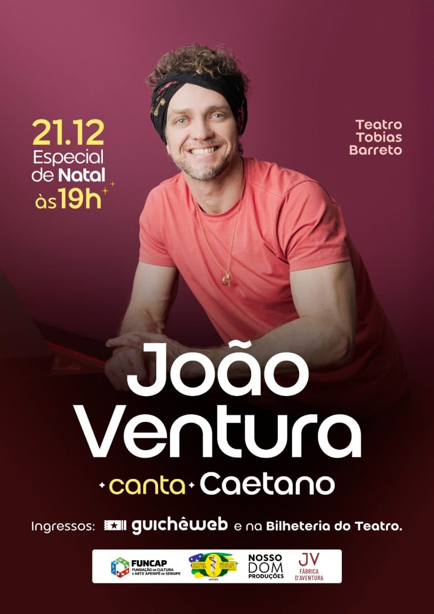 O cantor, pianista e compositor sergipano João Ventura retorna a Aracaju com o espetáculo “Especial de Natal – João Ventura Canta Caetano”, no sábado, 21 de dezembro, às 20h, no Teatro Tobias Barreto. Aclamado pelo público e pela crítica, o concerto tem rodado as principais casas de show e teatros do país, e chega especialmente a Aracaju para mais um encontro já tradicional com o público sergipano, reunindo emoção, sofisticação e a beleza das canções de Caetano Veloso sob o olhar singular de Ventura.