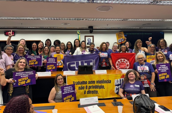 A dirigente sindical Adenilde Dantas reforçou que: “essa Convenção é um marco fundamental, porque diz em alto e bom som: violência e assédio não são parte do trabalho, são crimes e violações de direitos humanos! Para nós, mulheres, isso significa mais proteção, mais respeito e mais igualdade. Significa ter coragem de denunciar sem medo, significa que os patrões terão de prevenir e não mais silenciar diante dos abusos. Ratificar a Convenção 190 é garantir que o ambiente de trabalho seja um espaço de dignidade, liberdade e justiça. Nós não aceitamos mais o silêncio! Queremos um Brasil que respeite suas trabalhadoras”.