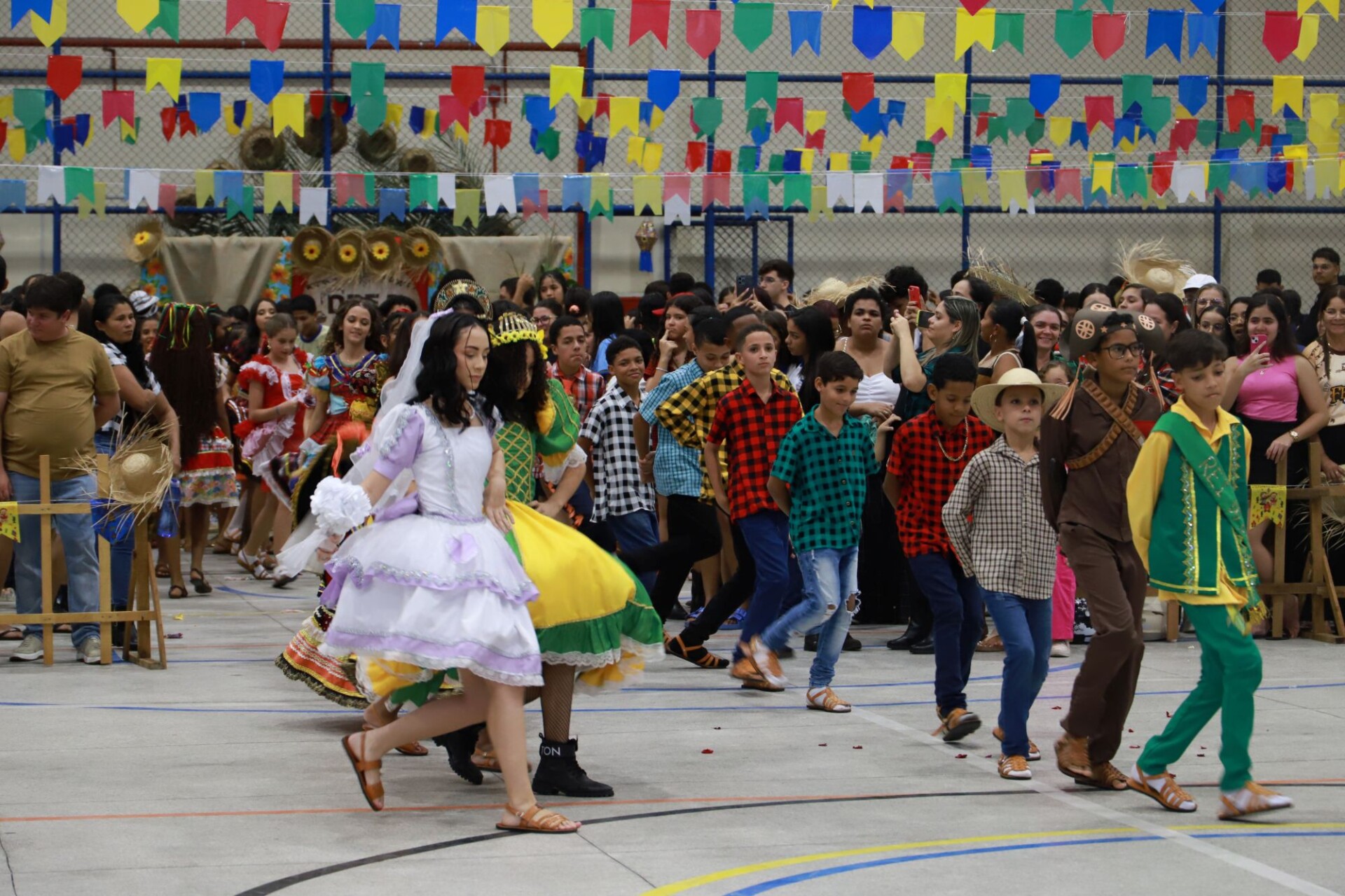 Com a rua repleta de barracas, os estudantes das unidades escolares presentes trouxeram comidas típicas como arroz doce, mungunzá, canjica, paçoca, além de representações culturais do período junino.