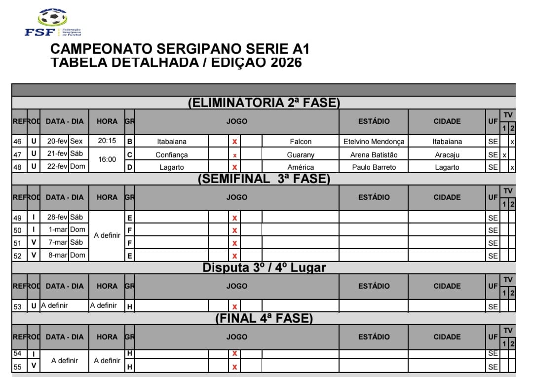 Em regime de plantão, o Departamento de Competições da Federação Sergipana de Futebol (FSF) divulgou neste sábado (14/02), os detalhes dos confrontos da segunda fase do Campeonato Sergipano da Série A1 de 2026.