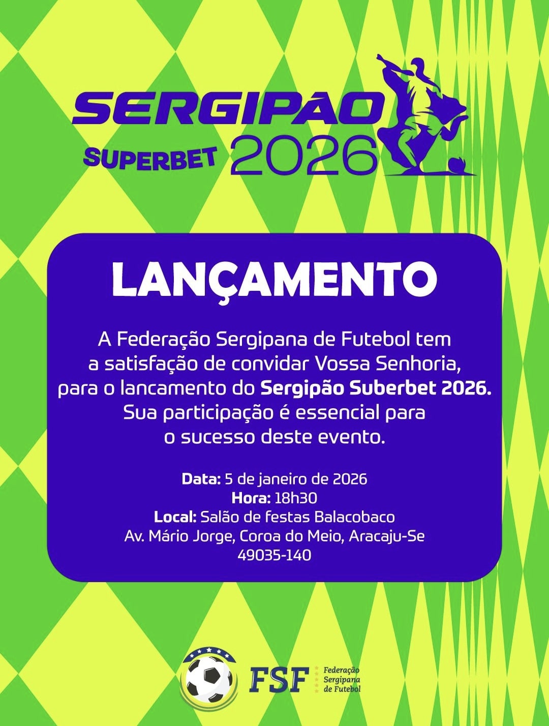 A solenidade de lançamento do Sergipão SuperBet 2026, vai contar com as presenças dos dirigentes das equipes do estadual, autoridades esportivas e convidados especiais. Na oportunidade, o presidente da FSF, Milton Dantas, fará uma demonstração de como será a competição e vai anunciar os nomes dos patrocinadores oficiais, dos apoios e parcerias firmadas para esta temporada.