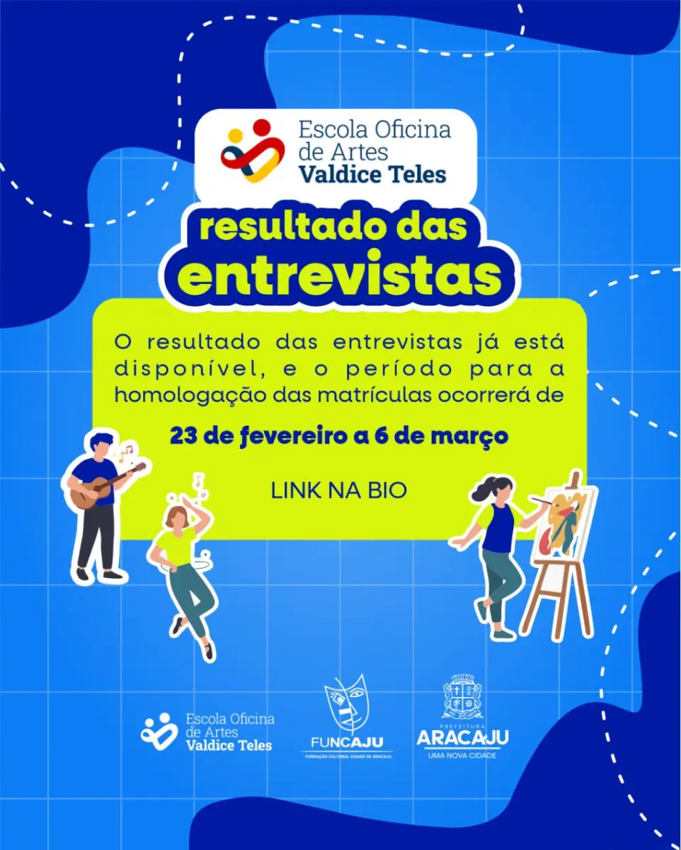 A Prefeitura de Aracaju, por meio da Fundação Cultural Cidade de Aracaju (Funcaju) e da Escola Oficina de Artes Valdice Teles, publicou nesta segunda-feira, 9, o resultado das entrevistas do processo seletivo para as oficinas do primeiro semestre de 2026. A lista está disponível no Diário Oficial do Município e no Linktree da Funcaju, assim como a lista com o resultado das solicitações de isenção de taxa.