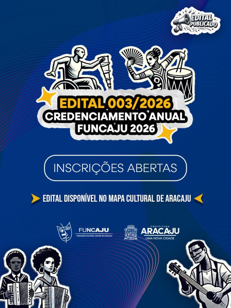 A Prefeitura de Aracaju, por meio da Fundação Cultural Cidade de Aracaju (Funcaju), publicou na última sexta-feira, 23, o Edital de Credenciamento Anual da Funcaju nº 003/2026. As inscrições são gratuitas e devem ser realizadas exclusivamente pelo Mapa Cultural de Aracaju até o dia 31 de dezembro de 2026.
