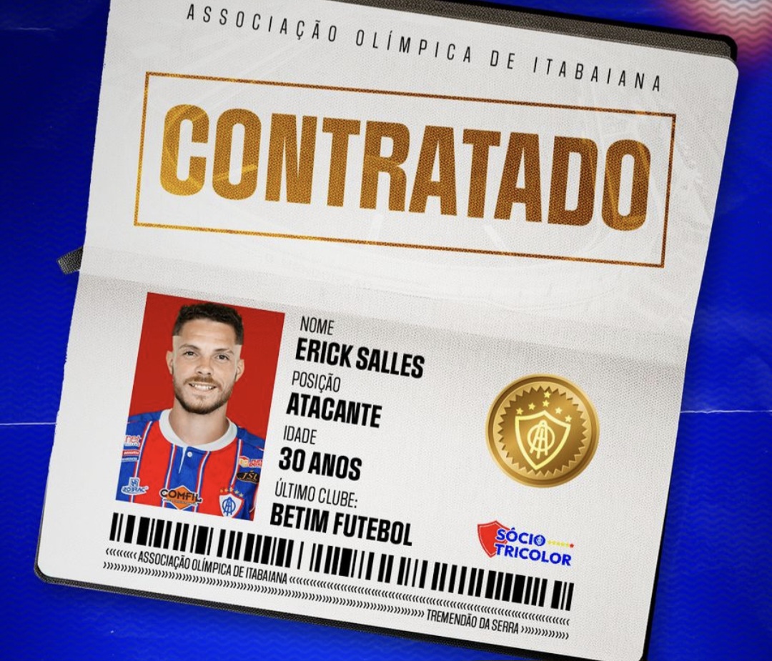 O Itabaiana anunciou mais um reforço para a sequência da temporada 2025. Trata-se do atacante Erick Lender Salles, de 30 anos, que estava defendendo o Betim Futebol, onde marcou um gol no Campeonato Mineiro deste ano.