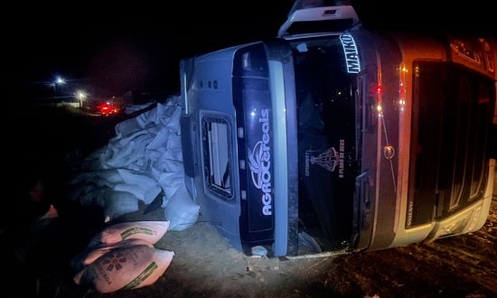 No local, os policiais encontraram o veículo de carga e seus dois semirreboques tombados sobre a pista, sem a presença do condutor. Populares informaram ao BPRv que o condutor foi socorrido por terceiros antes da chegada da equipe policial e encaminhado a uma unidade hospitalar. Por esse motivo, não foi possível realizar o teste de alcoolemia.