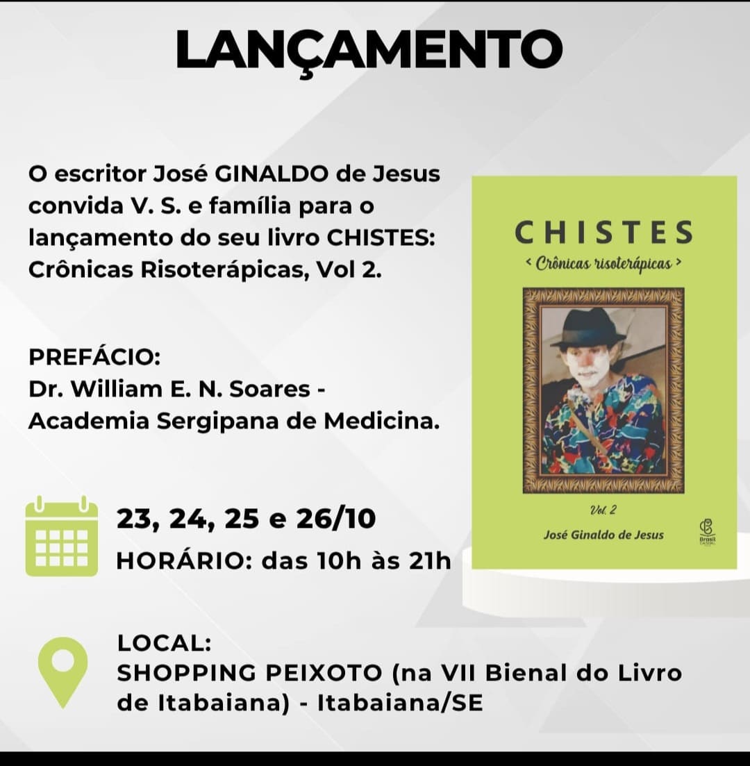 Em um cenário marcado por tantas violências, tristezas e preocupações que geram stress e até depressão, o escritor José Ginaldo de Jesus oferece uma oportunidade para rir e refletir com seu novo lançamento, o livro “CHISTES: Crônicas Risoterápicas – Vol. 2”. Esta obra é o 11º livro do autor e está alinhada com a risoterapia, ou terapia do riso, que busca resgatar a espontaneidade da infância, permitindo que as pessoas riam sem esforço e alcancem uma melhora emocional.