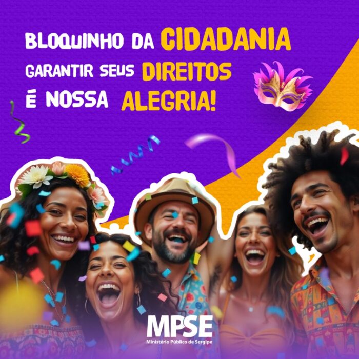 O Ministério Público de Sergipe convida todos a fazerem parte do ‘Bloquinho da Cidadania’ e garantirem um carnaval seguro, inclusivo e respeitoso. Denuncie qualquer violação de direitos e ajude a construir uma folia marcada pelo respeito e pela responsabilidade!