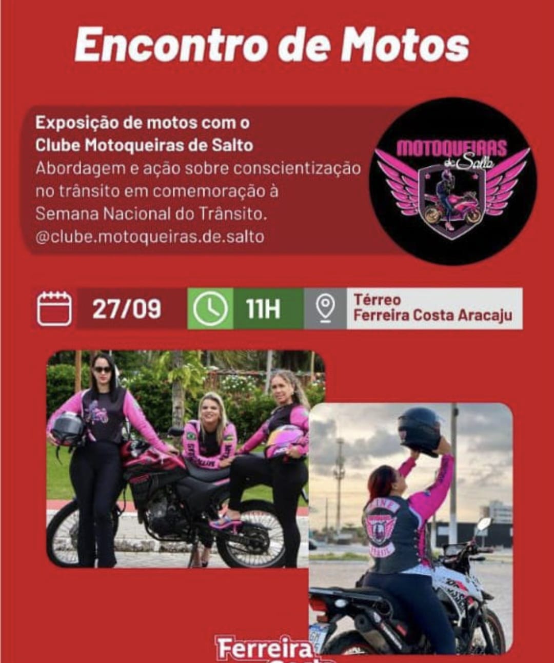 O Clube Motoqueiras de Salto fará um encontro com mulheres, no dia 27 de setembro, a partir das 11h, no térreo do Ferreira Costa, em Aracaju, evento de conscientização e comemoração alusivo à Semana Nacional do Trânsito.
