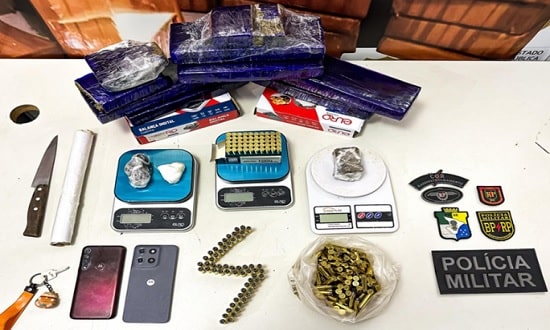 No imóvel, foram localizados cinco quilos de maconha, 50 gramas de crack e 25 gramas de cocaína, além de 229 munições calibre .38 e 50 munições calibre .9mm. Três balanças de precisão, uma faca e um rolo de papel filme utilizados na preparação dos entorpecentes também foram apreendidos.