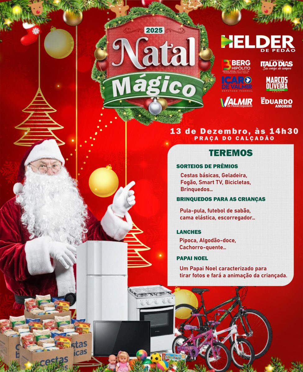 Para deixar o dia ainda mais especial, o evento contará com sorteios de cestas básicas, geladeira, fogão, TV smart e bicicletas, espalhando ainda mais alegria entre a população. “O Natal Mágico é um gesto de solidariedade e afeto, unindo a comunidade em torno do espírito natalino, que inspira cuidado, generosidade e esperança”, finalizou um dos organizadores.