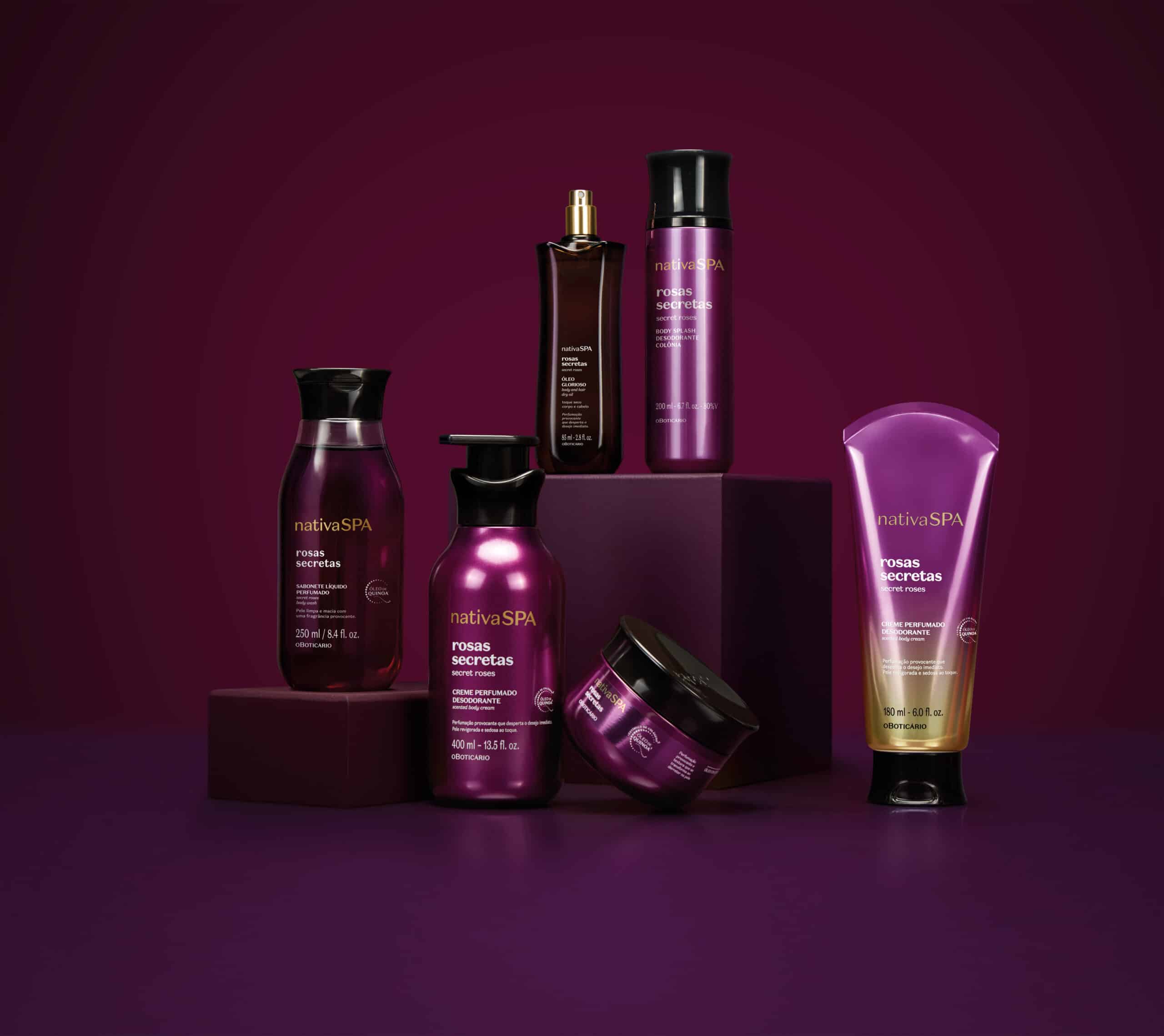 Inspirada na fragrância floral, ícone clássico da perfumaria, e na sensorialidade desenvolvida por meio da neurociência, o Boticário amplia o portfólio da sua maior marca de cuidados com o lançamento de Nativa SPA Rosas Secretas. Primeiro lançamento da marca com fragrância inspirada no olfativo da alta perfumaria árabe, traz a rosa turca como símbolo de intensidade, magnetismo e poder feminino decodificado numa linha completa de cuidados corporais que projeta alta perfumação.