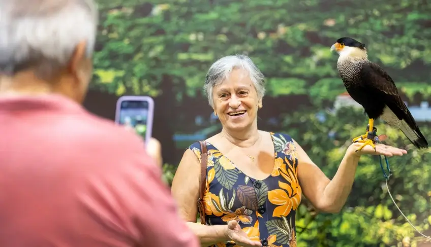 Entre os espaços mais comentados da feira está o que sai do óbvio e surpreende: uma área inteiramente dedicada ao Parque dos Falcões, com corujas, gavião, falcão e urubu. A presença dos animais ajuda a divulgar o parque como um destino turístico e reforça sua importância como o único centro de criação, multiplicação e preservação de aves de rapina da América do Sul.