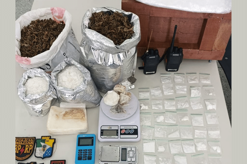 Ao todo, foram apreendidos aproximadamente 1.678 gramas de cocaína, 1.509 gramas de maconha e 55 gramas de crack, além de dois rádios comunicadores, uma maquineta de cartão, duas balanças de precisão, uma prensa de madeira, rolos de fita e embalagens plásticas.