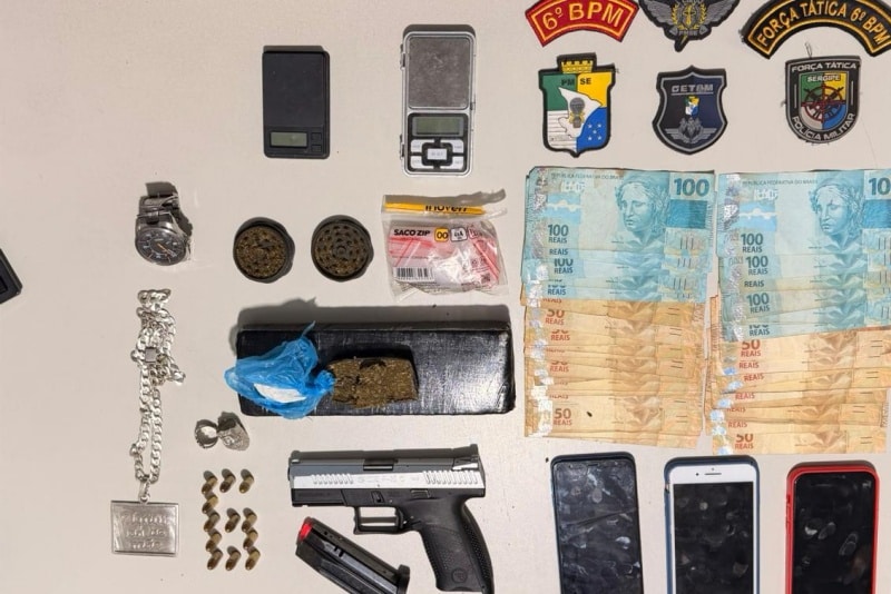 Diante da fundada suspeita, os agentes realizaram buscas no quintal do imóvel, onde encontraram a bolsa descartada pela dupla. Dentro da sacola, havia um tablete de maconha prensada, uma balança de precisão e uma pistola calibre .9mm carregada com 12 munições.