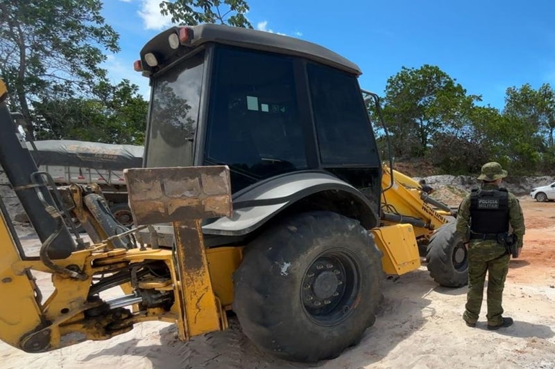 Segundo as informações policiais, a equipe tomou conhecimento da extração ilegal de minérios no município, via Ciosp. Ainda conforme os relatos, dois homens usavam uma retroescavadeira para extrair areia e utilizavam uma caçamba para o transporte.