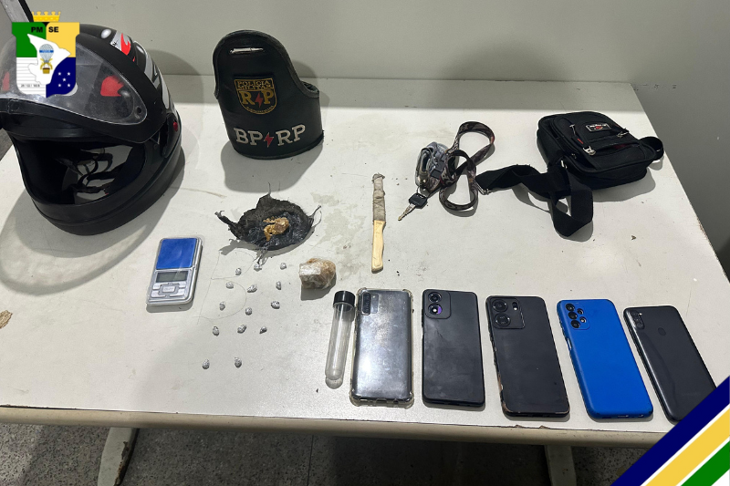 Ainda no imóvel, foram encontrados um invólucro médio contendo crack sobre a mesa, uma balança de precisão, uma faca e cinco aparelhos celulares.