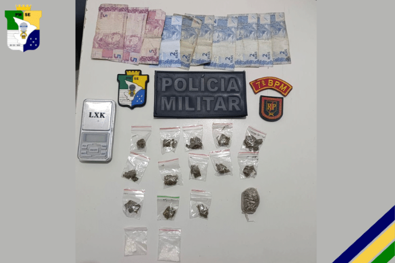 Durante a abordagem, o homem confessou sua participação sua roubo. Com ele, os militares apreenderam trouxinhas de maconha, papelotes de cocaína, uma balança de precisão, dinheiro e um aparelho celular. O suspeito ainda informou o envolvimento de um segundo homem.