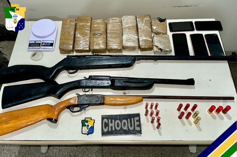 Em outra casa alugada pelo suspeito, no povoado Areia Branca, os policiais apreenderam três espingardas de diferentes calibres, munições e cerca de 5 Kg maconha.