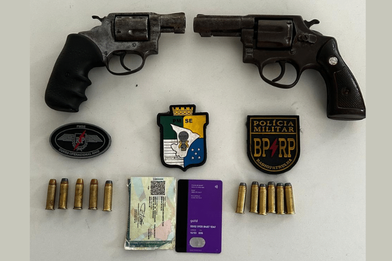 Durante as buscas, os militares apreenderam dois revólveres calibre .38, com 07 munições intactas e 04 munições percutidas, documentos pessoais e cartões de crédito.