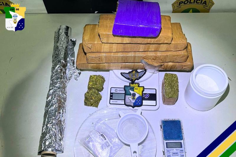 Durante patrulhamento, a equipe policial realizou busca pessoal em homem denunciado por suspeita de comérico ilícito de entorpecentes. Assim, foram encontradas cerca de 3,400 quilogramas de substância análoga à maconha e 200 gramas de substância análoga à cocaína com ele.
