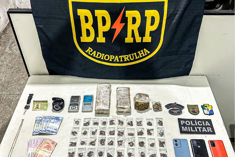 Em seguida, foi observado dois suspeitos tentando esconder drogas em uma residência. No interior do imóvel foram apreendidos aproximadamente 1,2kg de maconha, duas balanças de precisão, três celulares, embalagens tipo “ziplock” e R$ 87 em dinheiro.