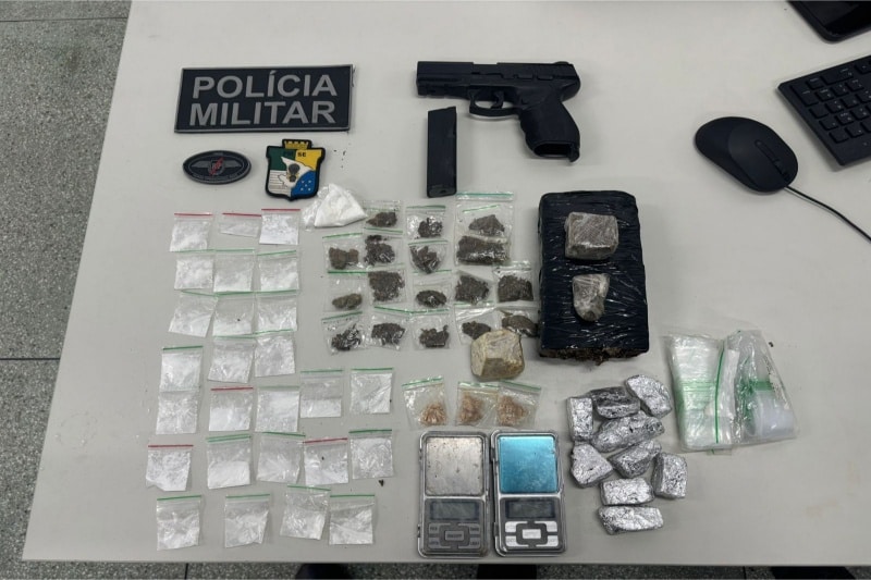 No local onde o suspeito estava foram encontradas quantidades de substâncias análogas a maconha, cocaína e crack armazenadas em papelotes, além de duas balanças de precisão. Já nas buscas no matagal foi encontrado um simulacro de arma de fogo. Todo material ilícito foi apreendido e apresentado à Central de Flagrantes para adoção das medidas legais cabíveis.