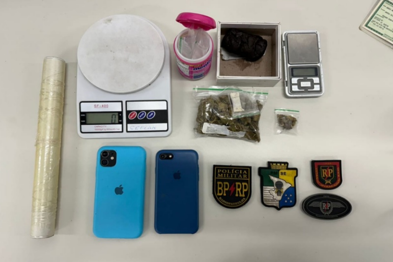 Os policiais se deslocaram até a residência do outro suspeito, onde encontraram mais material relacionado ao tráfico de drogas. No total, foram apreendidos 70g de haxixe tipo Ice, 31g de maconha, uma balança de precisão, embalagens do tipo “zip lock”, papel filme e dois celulares iPhone danificados.