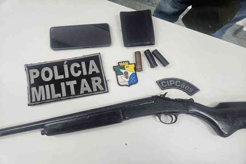 Ao chegarem no local, os policiais visualizaram um indivíduo com as características repassadas. Foi realizada a busca pessoal onde foi constatado que o suspeito portava uma espingarda.