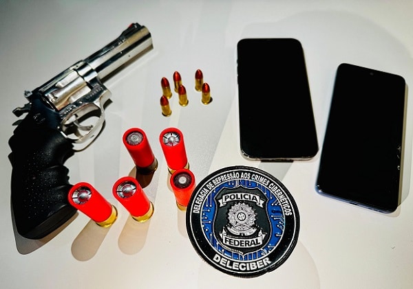 Além do material digital, os policiais encontraram uma arma de fogo sem registro. Diante do fato, o investigado foi preso em flagrante pelo crime de posse ilegal de arma de fogo e encaminhado à Superintendência Regional da Polícia Federal para os procedimentos cabíveis.
