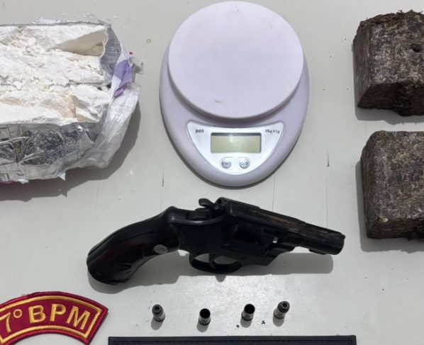 Com o infrator, que era foragido das justiça, os militares encontraram uma arma de fogo com numeração suprimida, seis munições, sendo quatro delas deflagradas, uma picotada e outra intacta, além de maconha e cocaína.