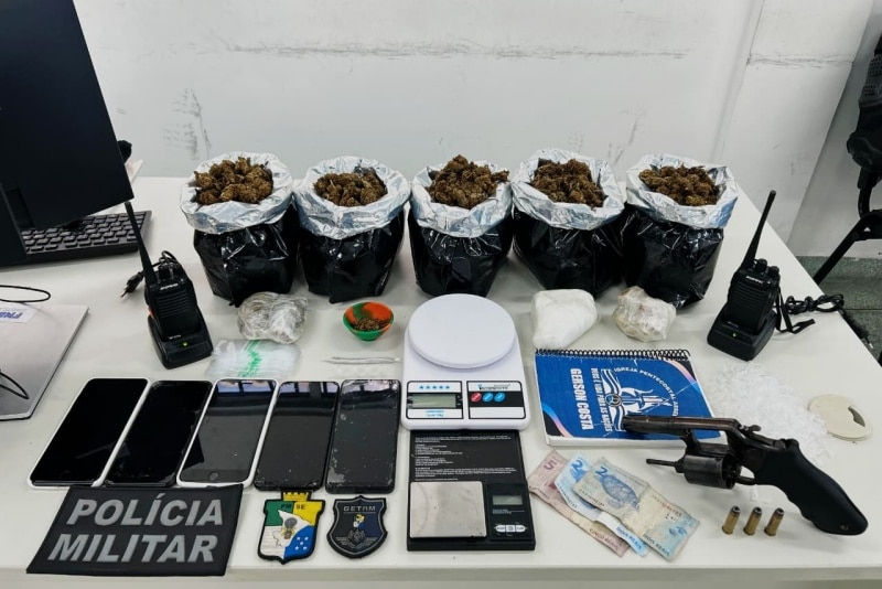 Durante as diligências, os policiais conseguiram apreender a arma de fogo descartada anteriormente, munições e aparelhos de comunicação utilizados pelos suspeitos, além de uma quantidade significativa de drogas, incluindo cinco sacolas contendo maconha do tipo flor, cocaína e crack, uma balança de precisão e materiais utilizados para o acondicionamento dos entorpecentes.