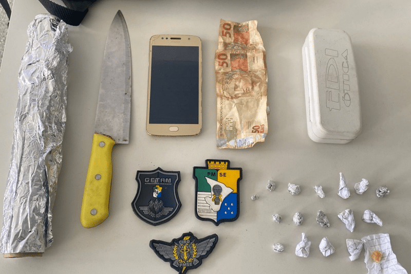 Ao realizarem a averiguação, foram encontrados no interior da bolsa 16 papelotes de substância análoga ao crack, a quantia de R$ 100 em dinheiro, uma faca do tipo peixeira, um aparelho celular e papel alumínio.